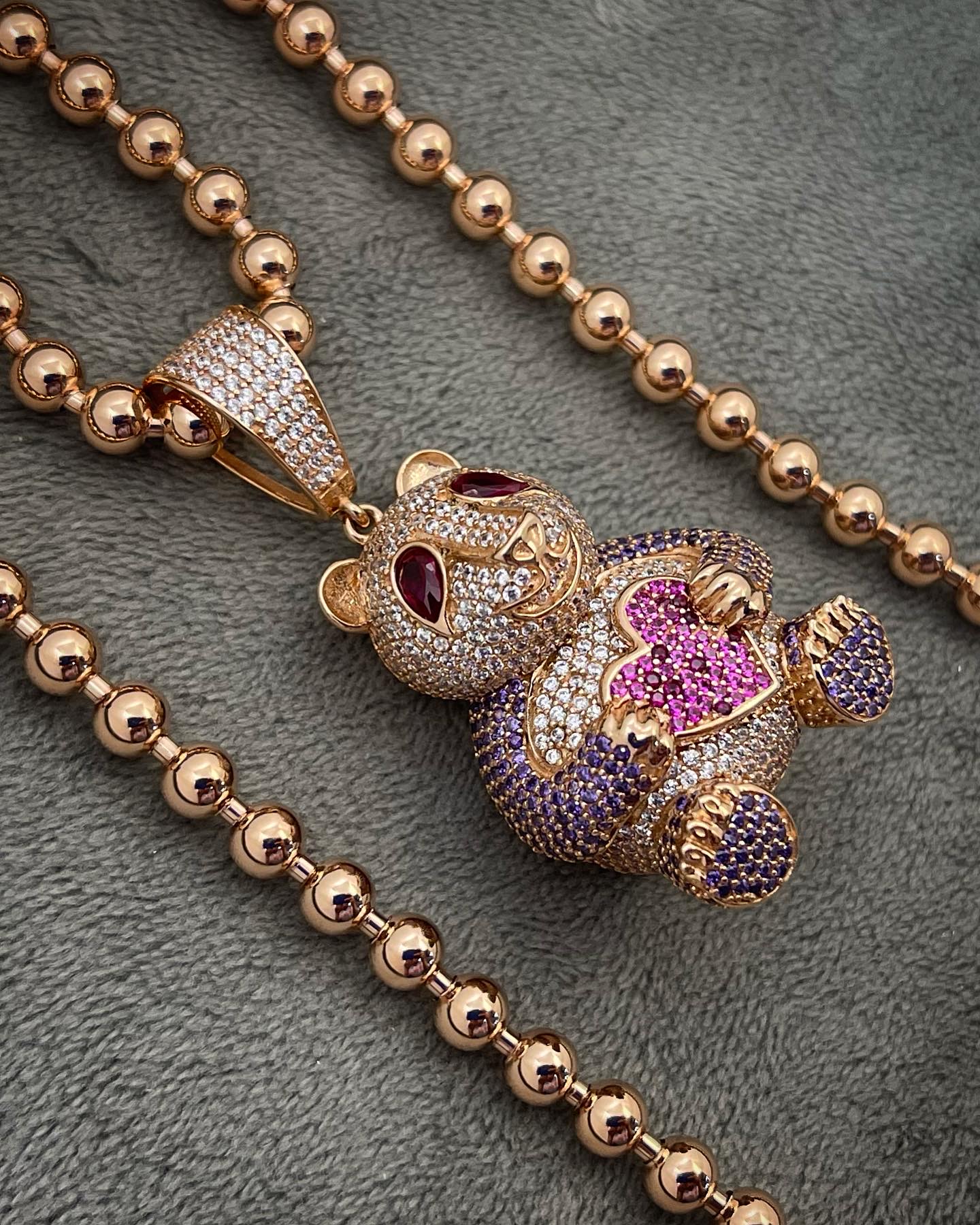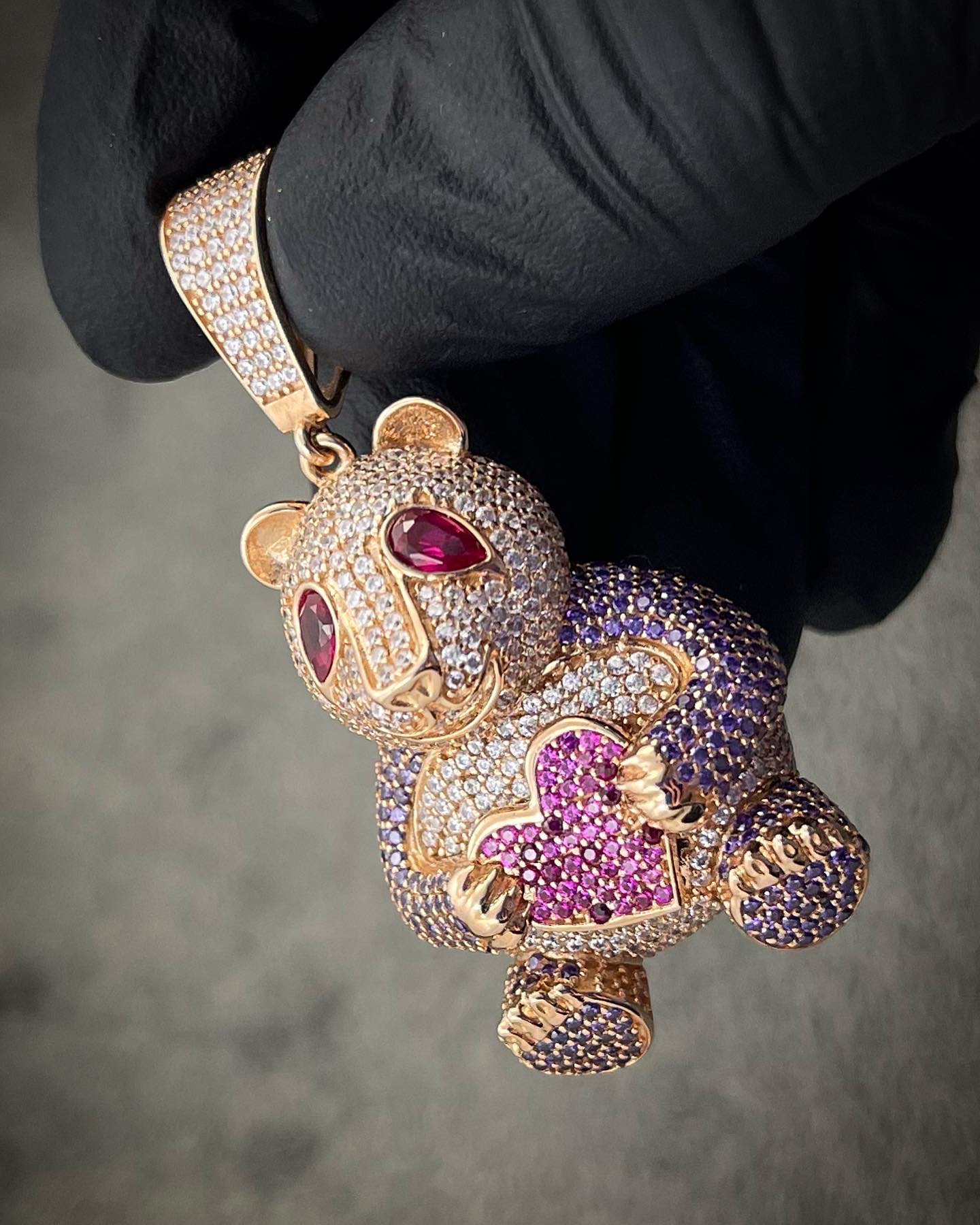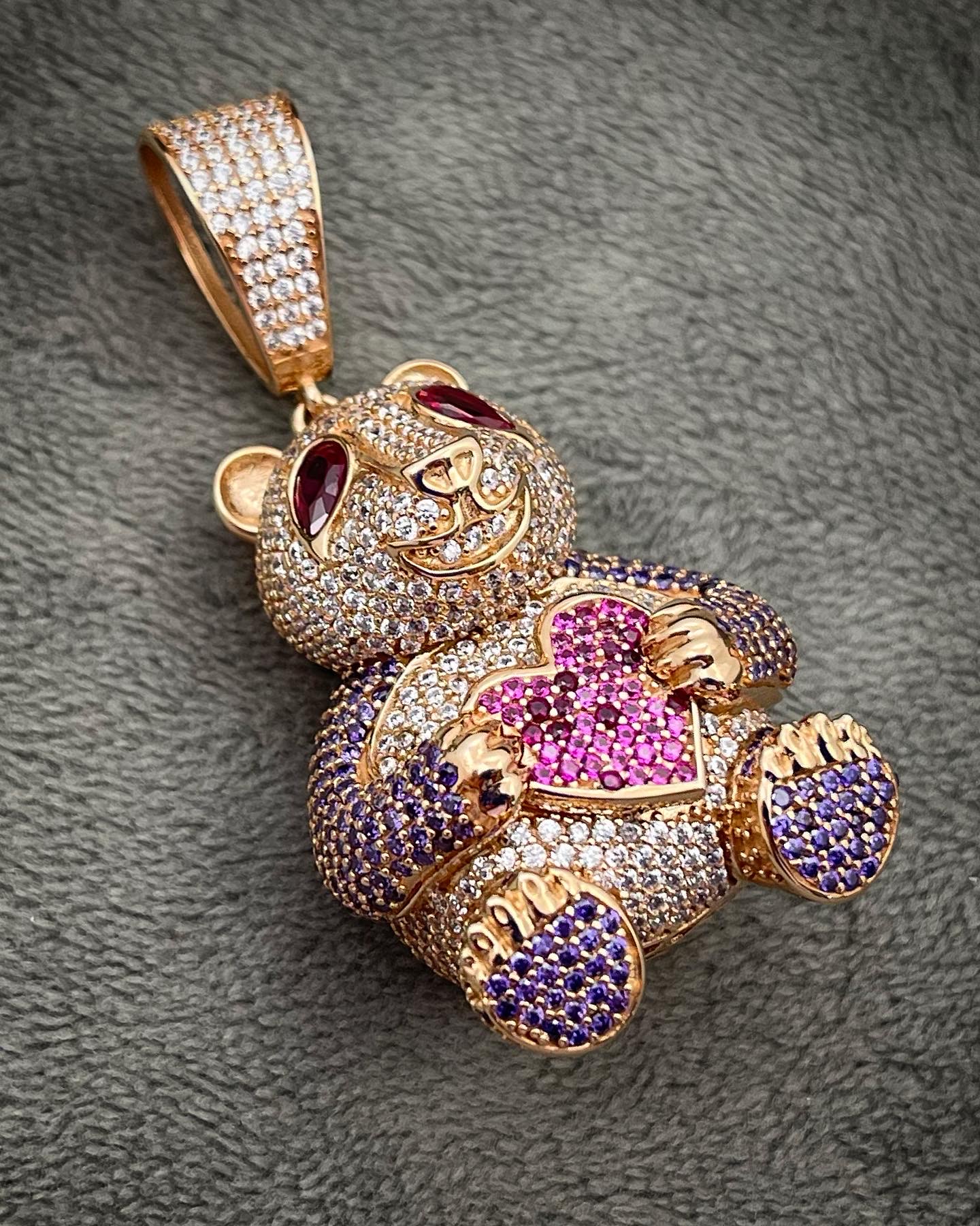 Hermoso Dije De Oso Con Swarovski Blanco Morado Y Fucsia, Tiene Una Terminación Y Detalles Muy Nítidos.