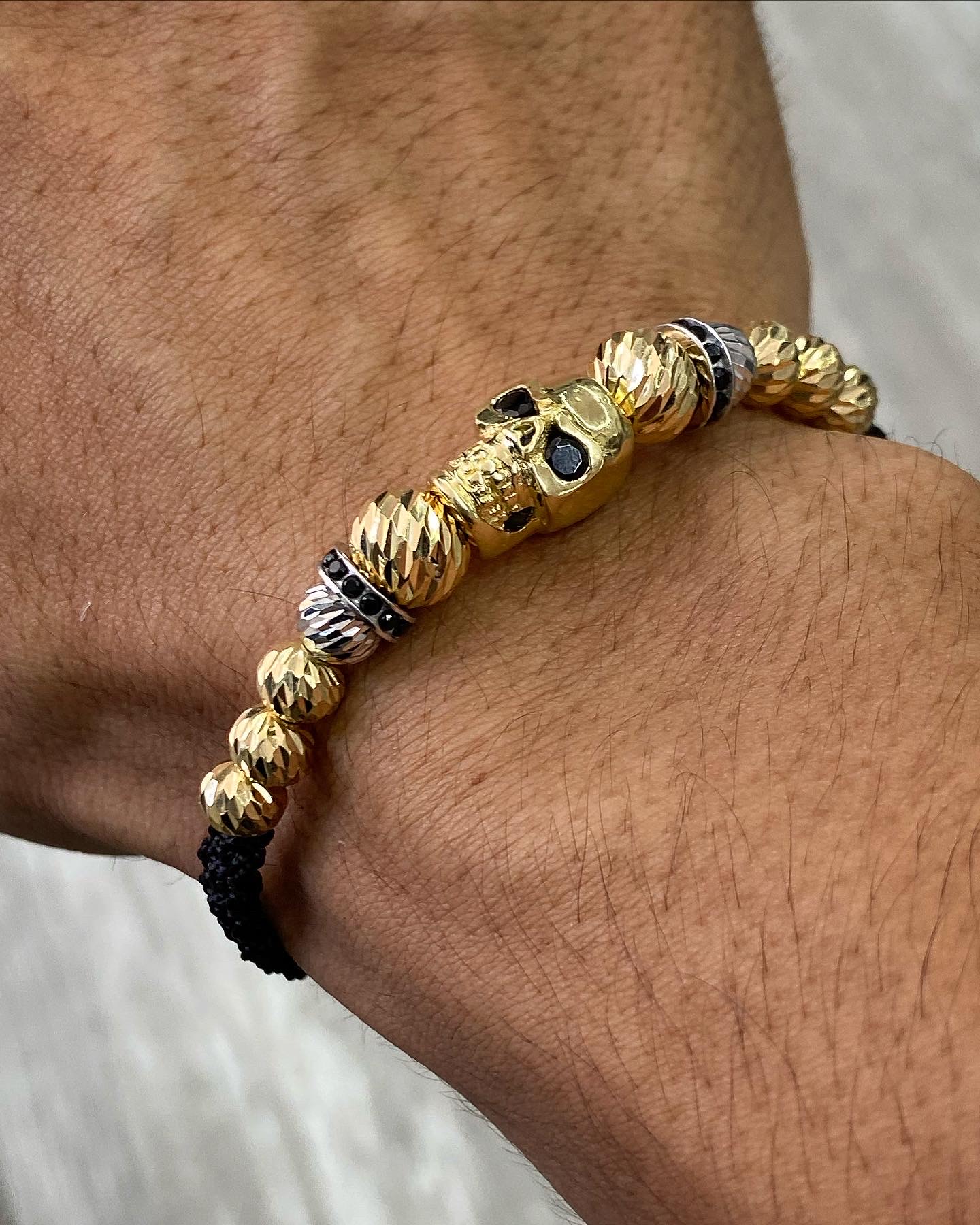 Pulsera En Hilo Negro Con Herraje De Calavera Oro Amarillo Y Blanco 18k