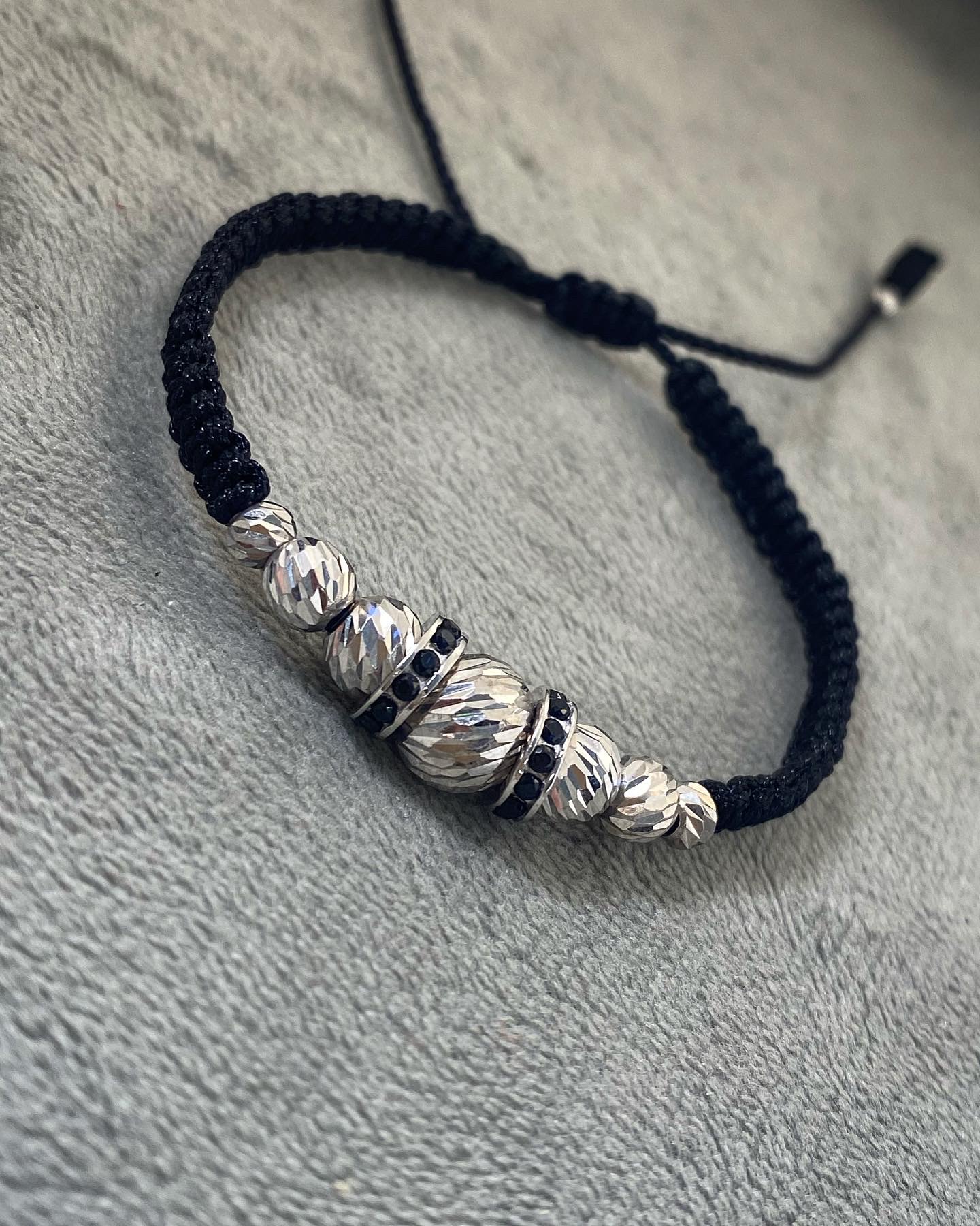 Pulsera En Hilo Negro Herraje Redondo Con Swarovski Negro Oro Blanco 18k
