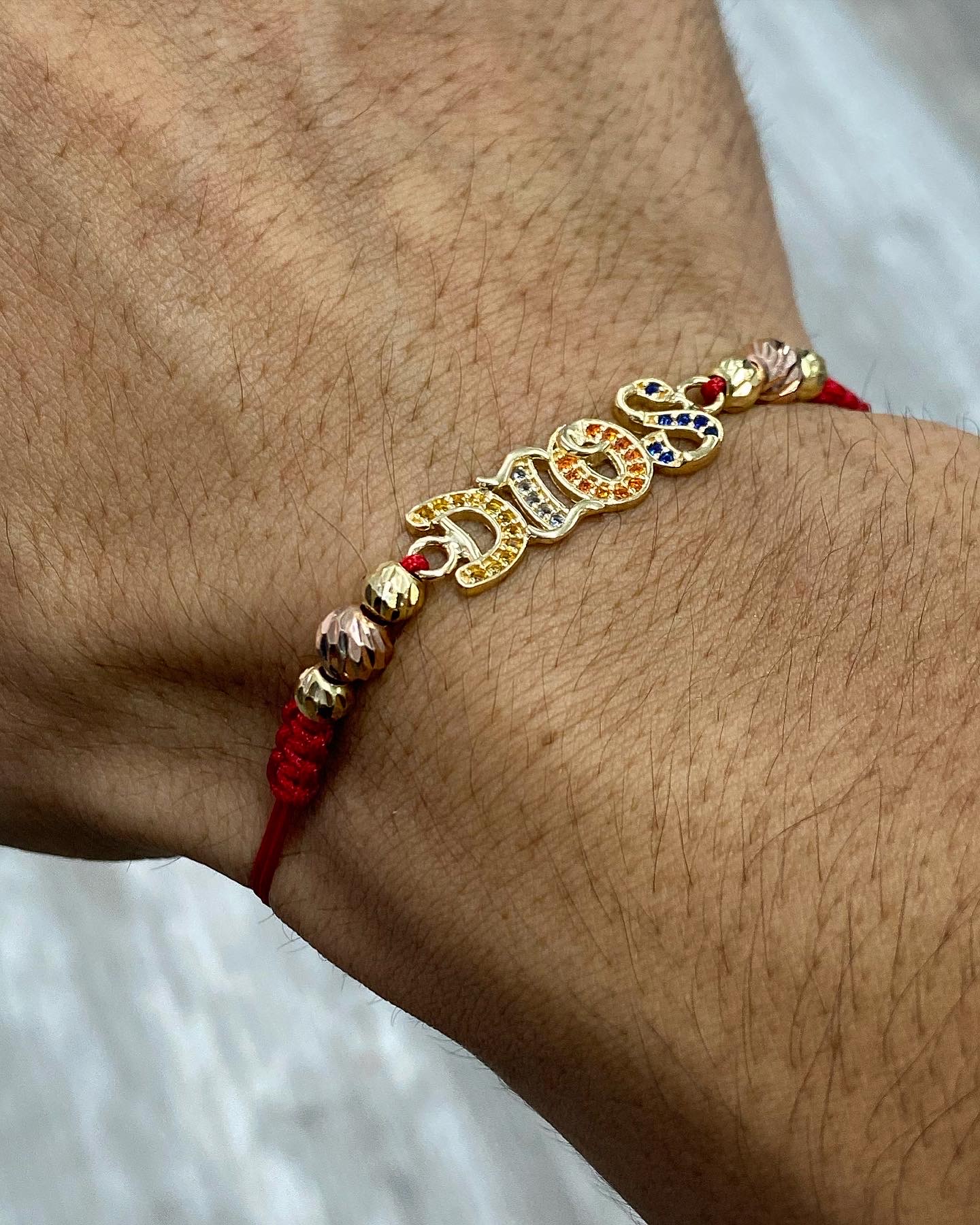 Pulsera En Hilo Rojo Con Herraje De Dios Con Swarovski Multicolor Oro Amarillo Y Rosa 18k