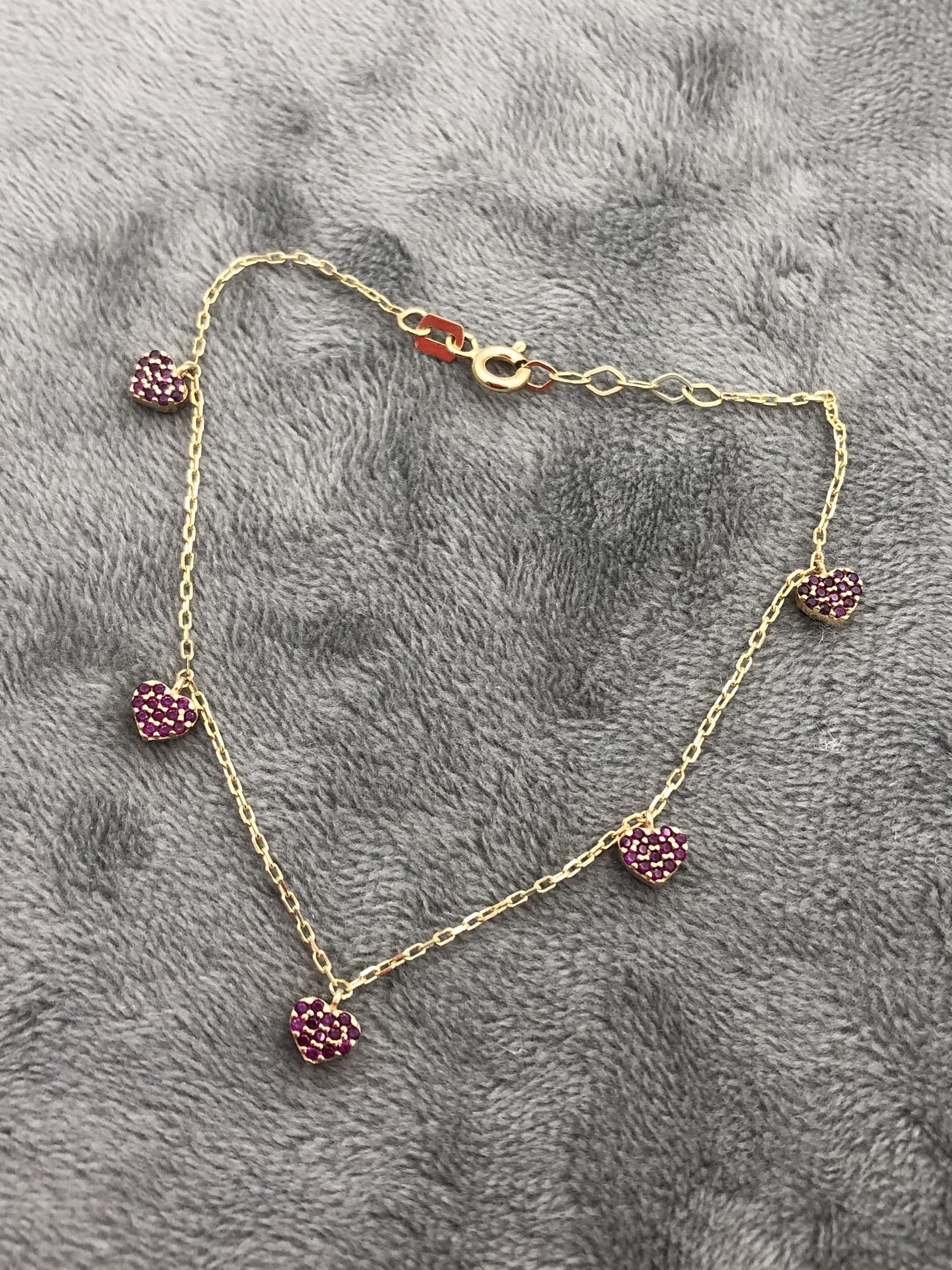 Hermoso Pulso con Dijes de Corazones con Swarovskis Fucsias en Oro Amarillo 18K 2.7gr